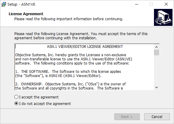 The user should carefully read and understand the license terms. Once this is done, click the "I accept the agreement" radio button to enable the Next > button. Click Next > to specify where ASN1VE will be installed: