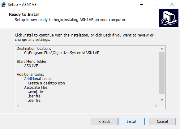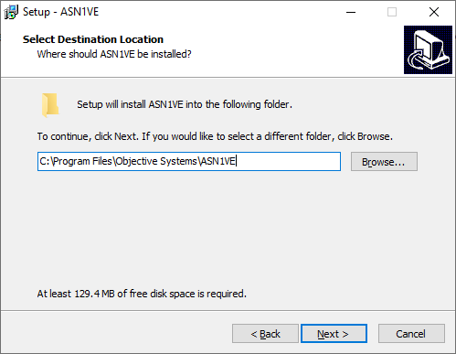 By default, the product is installed in C:\Program Files \Objective Systems\ASN1VE, but some users may prefer to install elsewhere. For example, the path could be changed to C:\Program Files\Objective Systems\ASN1VE_v*** to allow multiple versions to be installed.