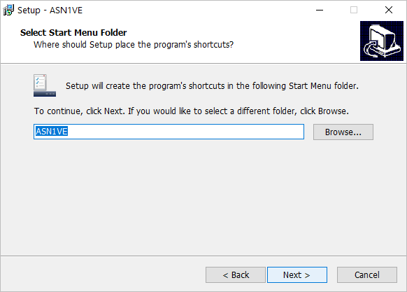 This dialog allows the user to define the folder in which ASN1VE is found on the Windows Start menu (accessible when the user clicks the Windows Start button). The user can leave this as the default setting or select a different folder. Click Next > to continue.