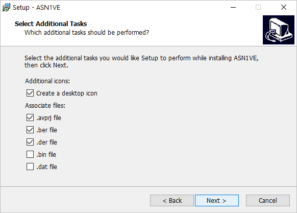 This allows a user to specify creation of a desktop icon as well as file extension associations. Of these associations, the .avproj file association will cause ASN1VE to be launched into project mode to read in all details of the selected project. All other associated files are assumed to be binary files containing ASN.1-encoded data to be loaded. ASN1VE will launch into the Open File dialog upon activation of files with these extensions. Additional associations may be added through the Windows Explorer file extension association feature.