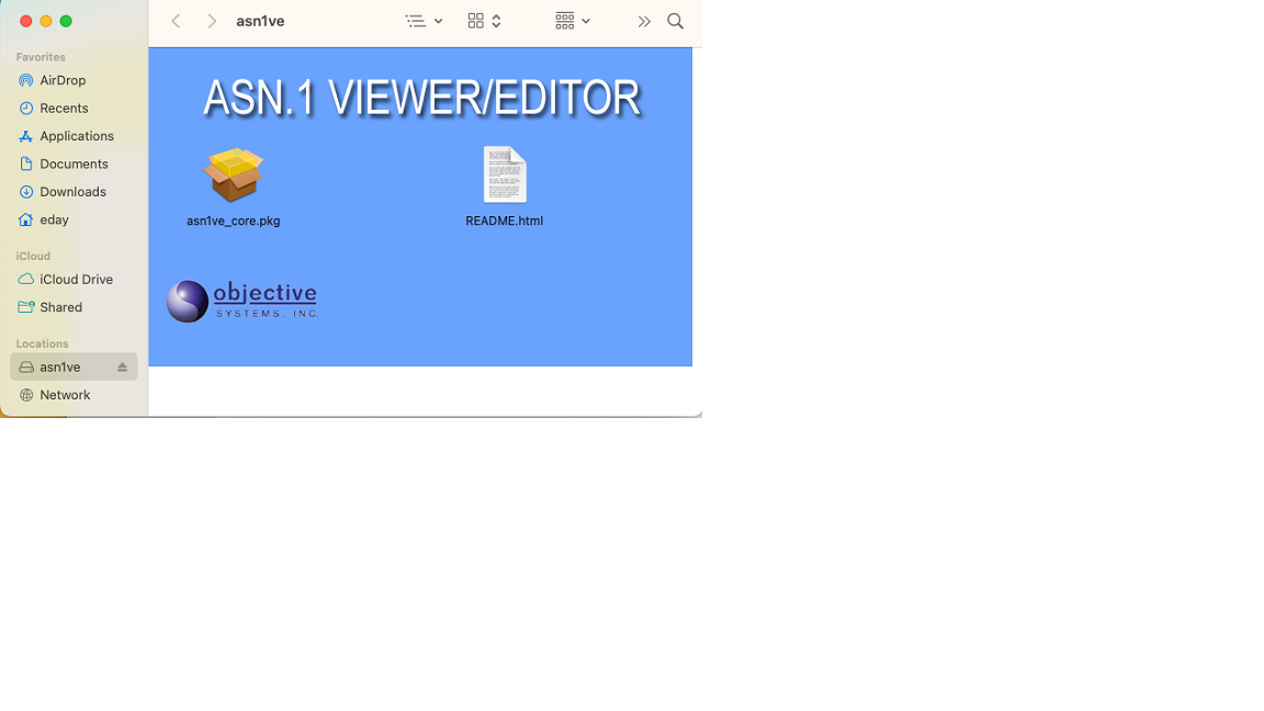 This screen displays a README.html and a package file named asn1ve_core.pkg. Double-click the asn1ve_core.pkg file to install the core ASN1VE software.