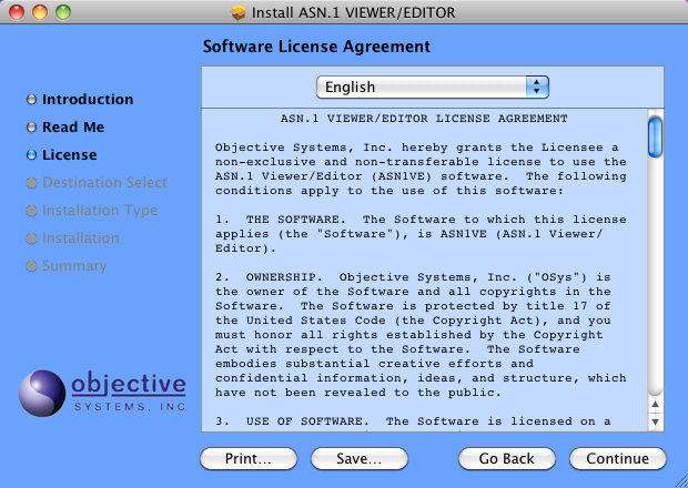 Click Continue. The License screen displays the Software License Agreement: