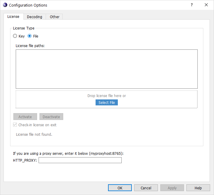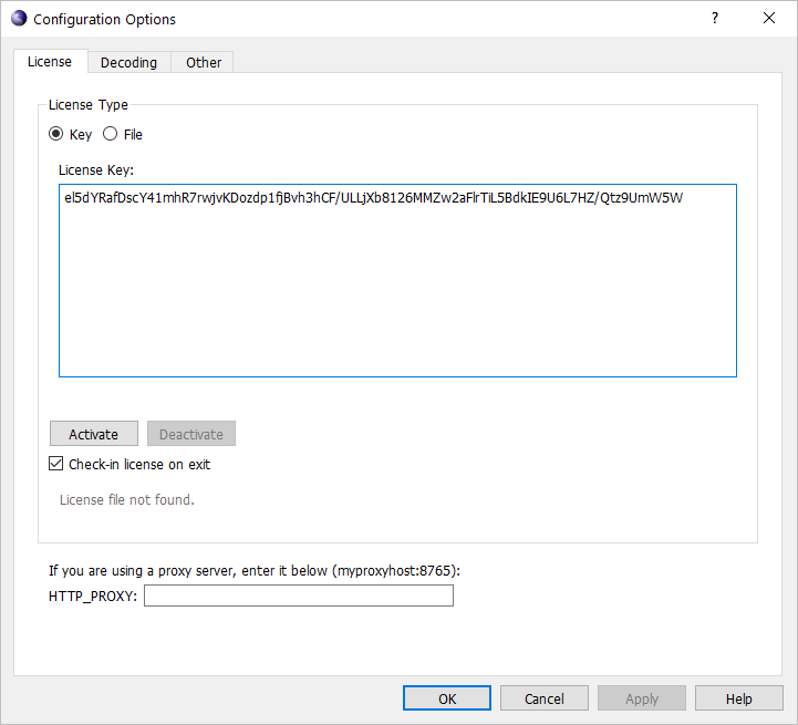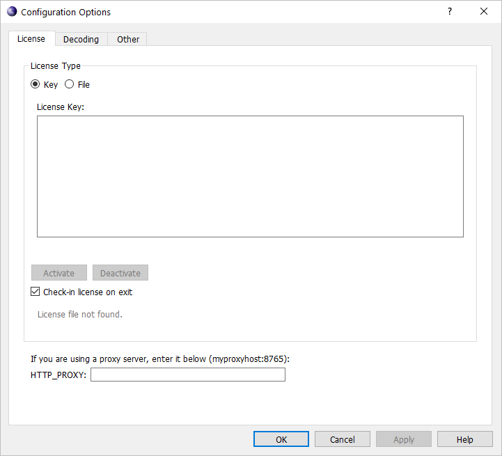 This will cause the Configuration Options window to be displayed. The License tab should be displayed. If not, click on it to display the license key entry screen: