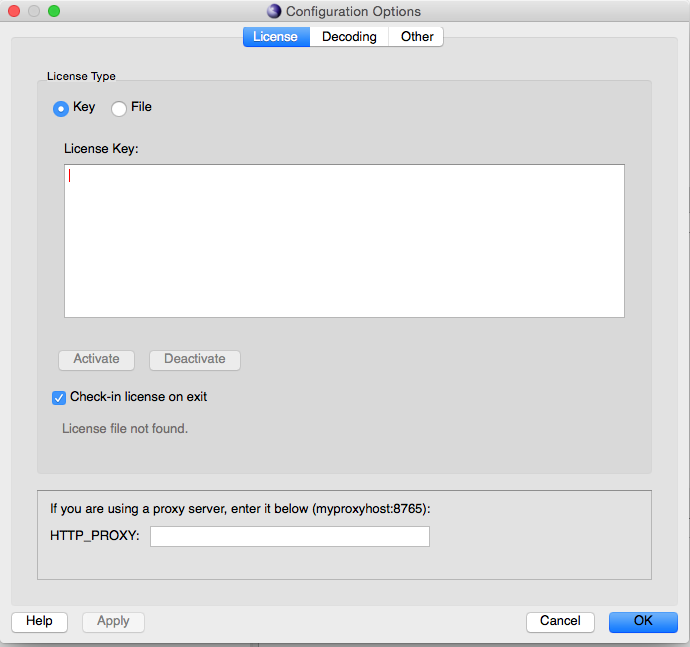 This will cause the Configuration Options window to be displayed. Click on the License tab at the top of this window to display the license key entry screen: