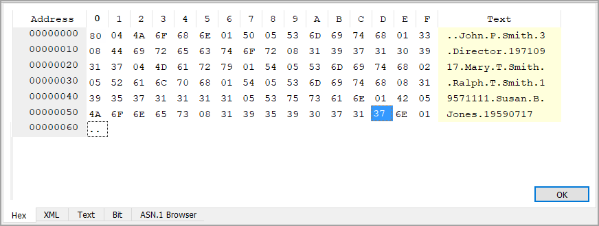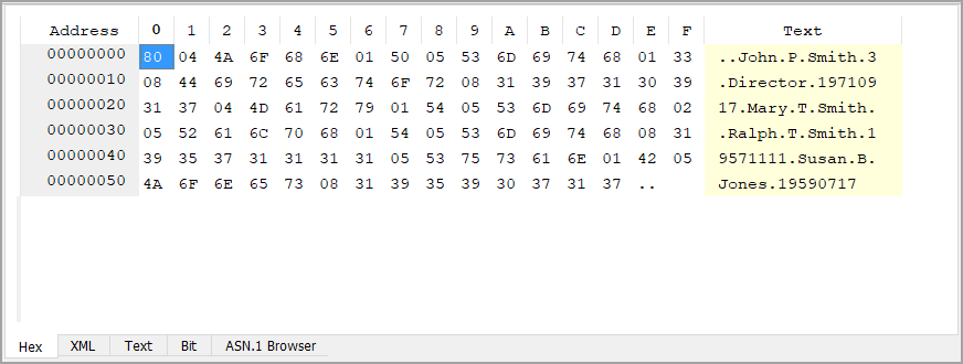 The group of columns in the middle (labeled 0 through F) shows the encoded message data in hexadecimal, one byte per column. This also functions as a hex editor.