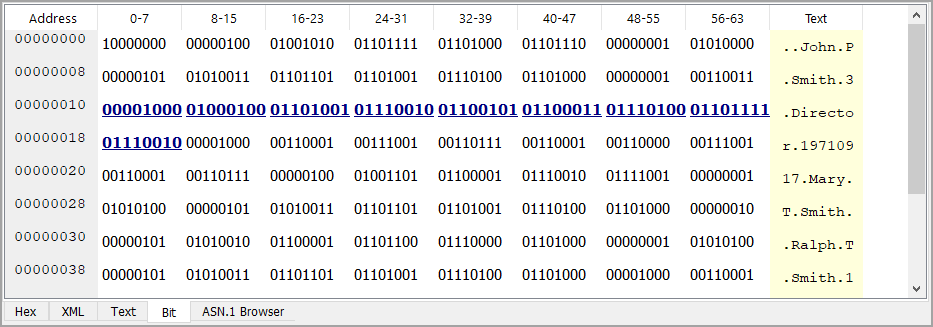 The Bit tab shows a binary view of the current message. (Note: This tab is only available for PER or UPER messages).
