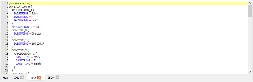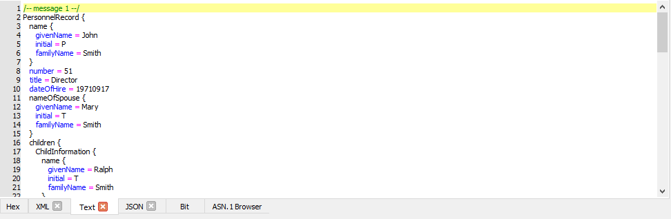 The encoding will differ depending on the Tree View. If the Tag View is currently active, then brace-text element names will be decoded tags (such as "CONTEXT_14"), except for UNIVERSAL tags, which are named for the type (such as "SEQUENCE"). The value of primitive elements will be a hexadecimal string of the encoded value.