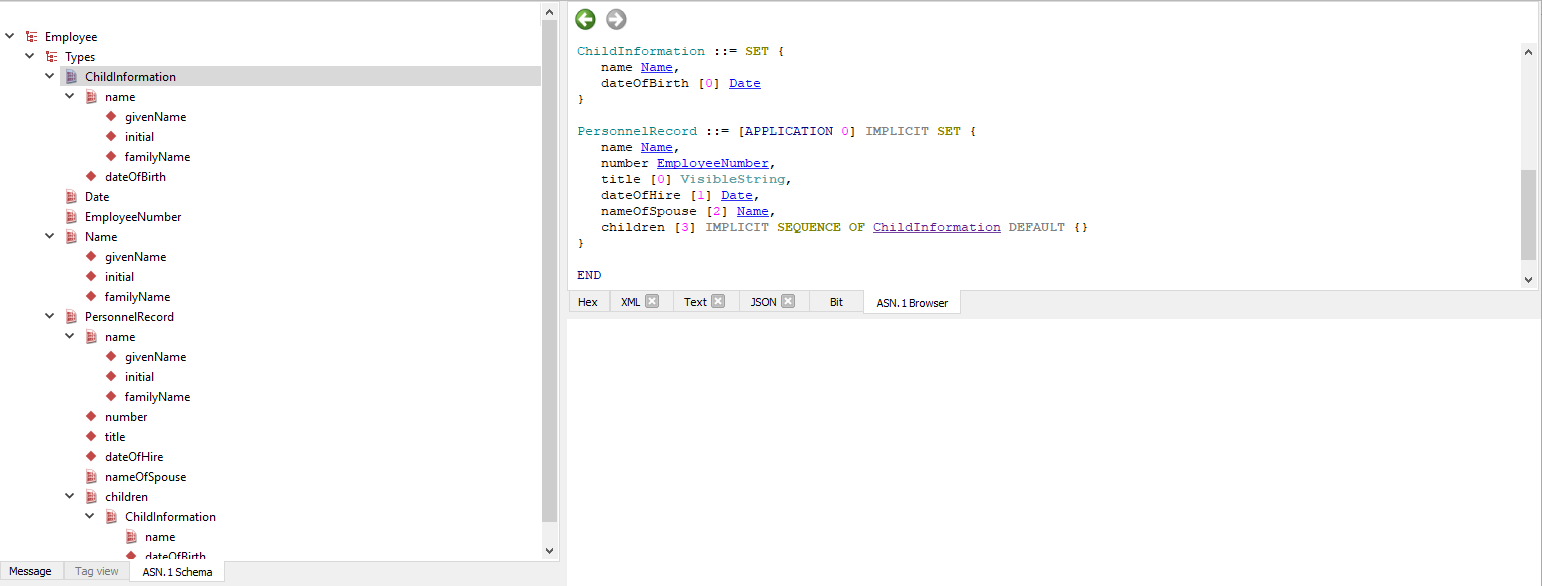 Clicking an element in the Schema View will also cause the corresponding definition to be shown in the ASN.1 Browser tab.