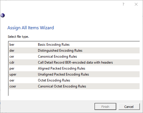 Binary data files are message files with no headers and which require no transformation of input data to binary format upon loading. These files may have generic extensions '.dat' or '.bin' or can have specific encoding rules extensions '.ber', '.der', '.per', or '.uper'. If a file with a specific encoding rule type is selected, the step in the wizard that selects encoding rules is skipped.
