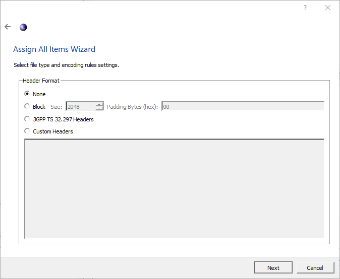 Custom headers are fixed-length headers that allow data fields within the headers to be specified. Selecting this option will cause an additional dialog to be opened that allows headers and header fields to be declared: