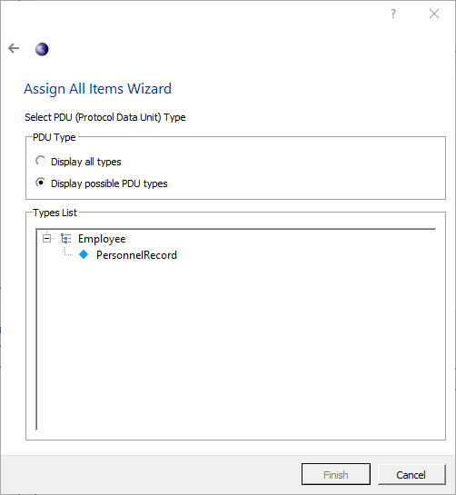 Click a node to select a PDU type. If the type desired is not shown, clicking Display all types at the top of the window will display a list of all the types defined in the selected schema. Once a PDU type is selected, click Finish.