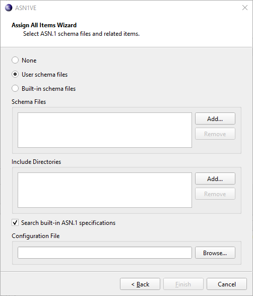 At the top, three options are available, None, User schema files, and Built-in schema files. The None option is only available for BER and allows a user to open a message without schema. The User schema files option allows the user to select their own ASN.1 schema files. Built-in schema files presents a list of available schemas built into ASN1VE.