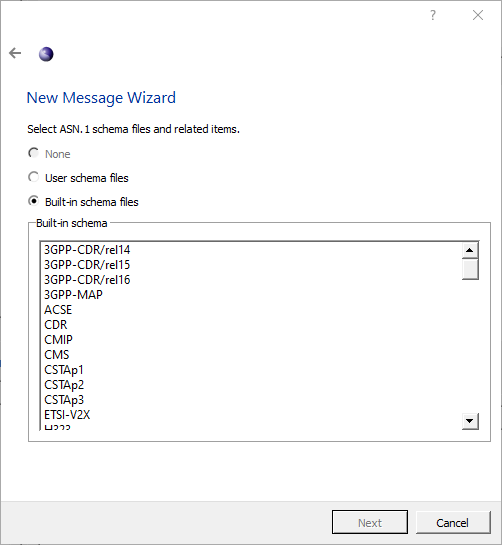 If Built-in schema files is selected at the top, the wizard will show a list of all the available built-in schemas in ASN1VE. Click to select a schema to use.