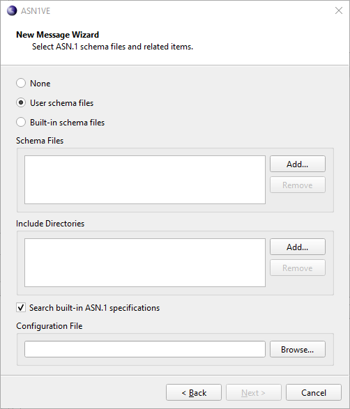 Below the selection options, the wizard shows lists for schema files and include directories. ASN.1 schema files should be added to the list of schema files that define the type of message being created. Include directories are directories to search to resolve import statements within the selected schema files.