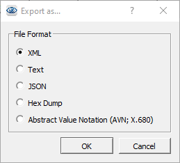 Choose XML, Text, JSON, Hex Dump or AVN in the dialog box and click OK. ASN1VE will then show a file dialog. Navigate to the directory in which the resulting file will be saved and enter a name for the new file. Click Save to complete the export procedure.