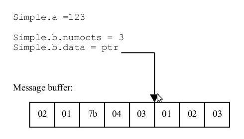 Assume an encoded value of this type contains a value of a = 123 (hex 7B) and b contains the hex octets 0x01 0x02 0x03. The generated variable for the OCTET STRING will contain a data pointer. So rather than allocate memory for this string and copy the data to it, fast copy will simply store a pointer directly to the data in the buffer: